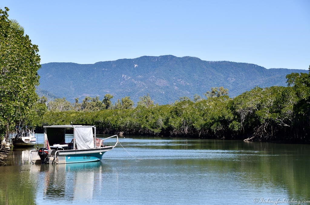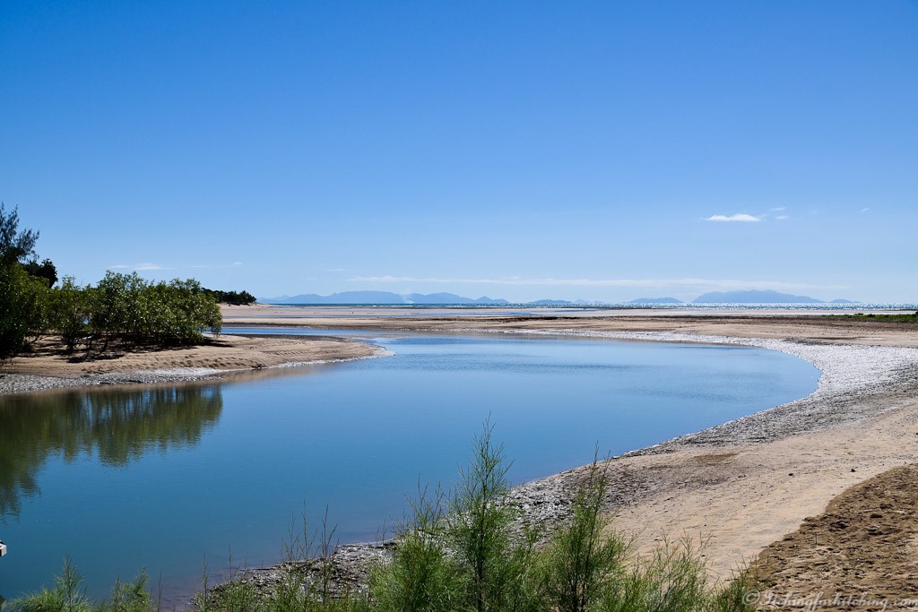 There’s seven of us now and we decide to drive over to Fisherman’s Landing cafe at Balgal Beach for lunch. If I haven’t already mentioned it, the cafe is a few hundred metres from our van, we can see it from our kitchen window, but it is a 14km drive owing to the resident croc in the creek. The cafe is priceless. I doubt they’ve spent anything in maintenance on this place since Queen Elizabeth took the throne. It is two storey and built of breeze blocks and it overlooks the creek. Inside the colourful tablecloths came from somebody’s grandma and two equally colourful ladies run the fryers. Damp tea towels flutter from the window the view from which is stunning. There’s the creek below and out to the east, the Coral Sea and the islands that adorn the Great Barrier Reef.