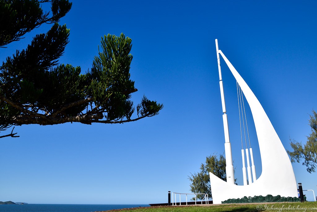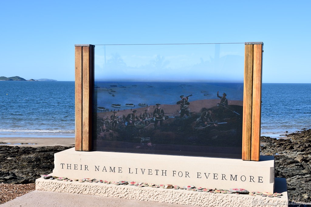 In Emu Park there is an ANZAC commemorative walk along the cliff top. There are gardens of rosemary and etched sandstone, silhouettes of the troops marching in France and the most delicate image of the Gallipoli landing on clear glass that uses the Coral Sea behind it as its own backdrop. An irony being that the Coral Sea was the site of a major battle in the Second World War. The Singing Ship vibrates in the breeze and commemorates arrival of Captain Cook.