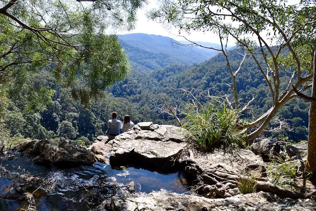 Only a few metres into the forest we get the view of the Purling Brook falls as they plummet to the valley floor. Far in the distance is the ocean and the highrise buildings of the Gold Coast. Some brave young French folk sit on the very edge of the falls kicking their legs and taking photos.