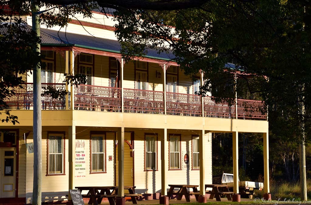 After the constant traffic noise at Burleigh Heads, Woody had requested that I find a quiet free camp and possibly with a pub. A few kilometres off the Grafton Road and hidden in the forest is a little dot of a town called Rappville. There are a hundred or so residents and of course being in the heart of the forest it all began with timber cutting. The pub was built in 1911 to a standard “Commercial Hotel” design. We soon learn that this design was used to build pubs all over the place. There was once a railway station opposite and railway tea rooms next door. The pub looked after the needs of ‘Commercial Travellers’ who travelled by train back then.