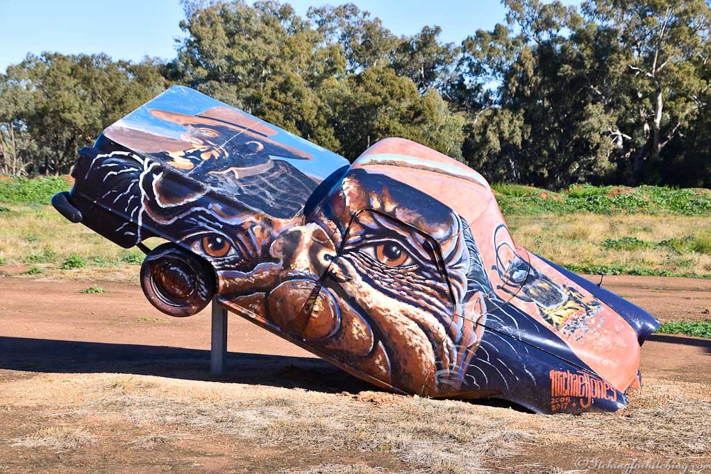 On the outskirts of Condobolin there is an amusing display called Utes in the Paddock which started in a farm paddock but has grown and been moved to a more convenient location for tourists. Old utes have been donated to be painted and sculpted to represent aspects of Australian life. It’s now a warm sunny morning and we dash back and forth picking out our favourite works. Even a truckie pulls in to snap a few pics.