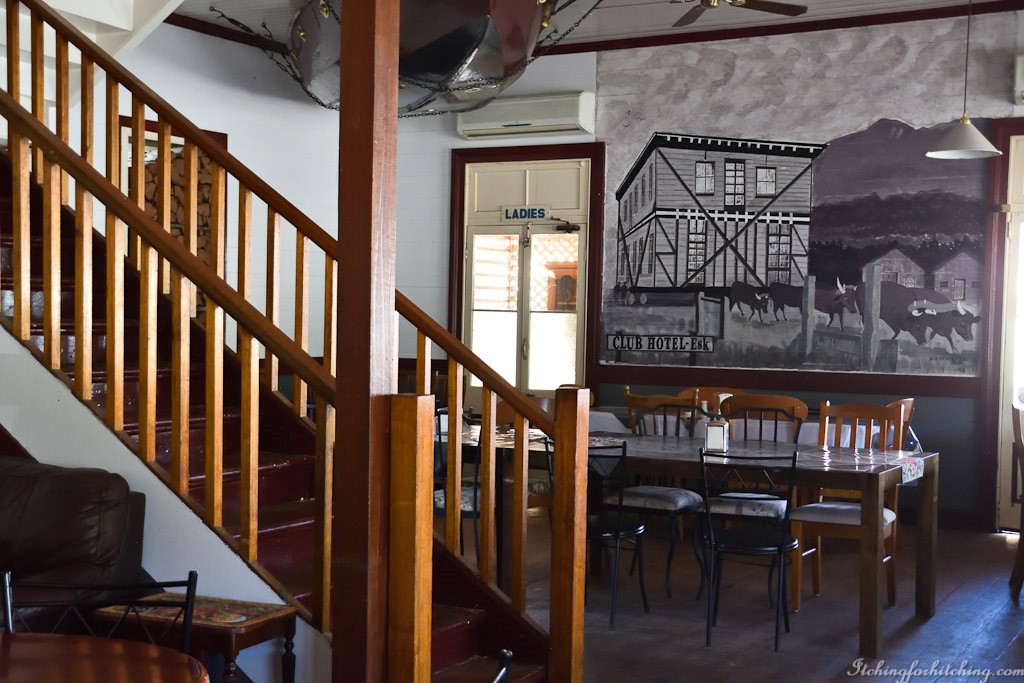 Returning to Esk we drop into the Club Hotel for a lunch of pie and chips… and what a pie! The old pub is yet another one that has been moved about and as proof there’s a photo and painting of it being hauled down the street. Each room is quirkily decorated in a rustic sort of way. We eat our scrummy pies perched on stools in the warm sun underneath the outside staircase.