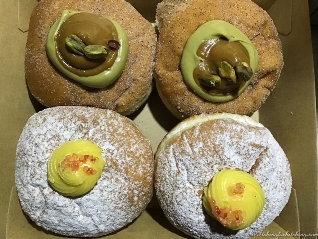 We’ve been intrigued by the Kenilworth Bakery. It has two shops side by side one selling savoury the other sweet. The sweet one advertises donuts and each morning a queue stretches along the street. Woody weakens and joins the line at 7:30am and returns with a big grin, a box of 4 donuts and his wallet $26 lighter. We’re not donut eaters but these are sensational. Lemon Curd and Pistachio & Caramel.