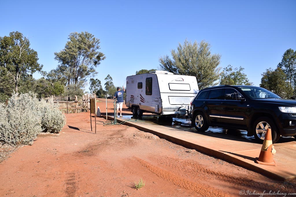 We bid our farewells to Craig and use their wash area to clean the underside of the car and van to get rid of any Parthenium weed seeds as he has warned us that not only trucks but caravans are spreaders of this noxious weed. No doubt the weeds are as popular as a dry rissole.