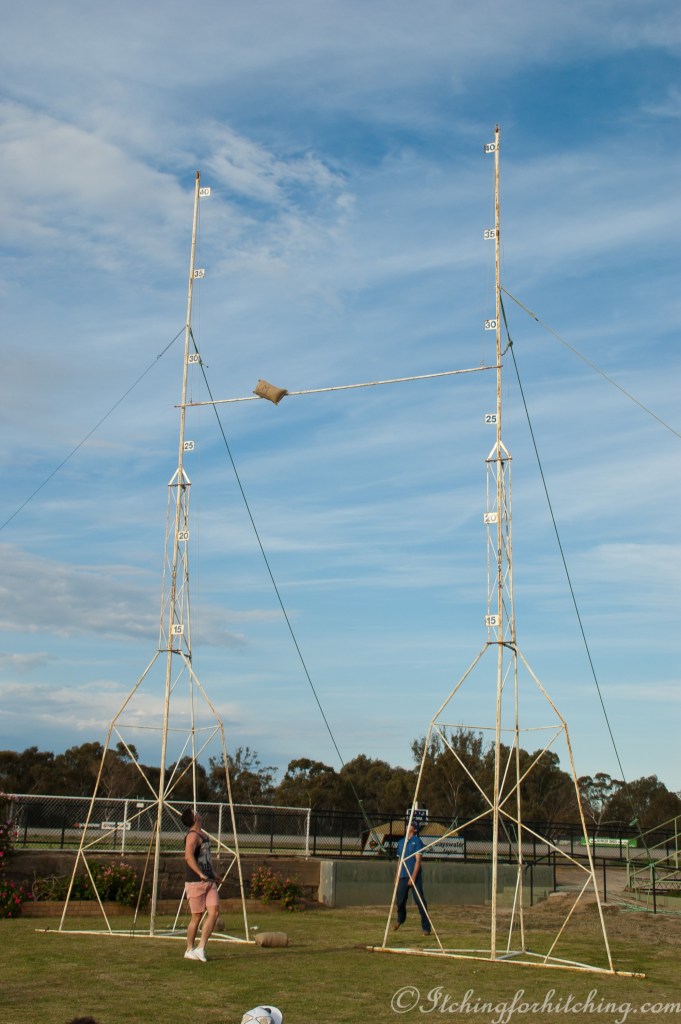 We arrive in Charlton to find a ghost town, everything is closed, the locals have all gone off to the Charlton Show. We park in a wide area behind the shops which is signposted as Travellers Rest. We walk the deserted main street and then set off for the free camp at Teddy Waddy, 8kms north of town. Sadly it’s right on the main road, dusty and very exposed, it’s a bit disappointing, so we return to town and find that the Travellers Rest is more than we first thought. There is not only parking, toilets and a bus stop, but beyond that is an area of en-suite sites for $25 and further on a free camp, where three vans are already set up. It is a lovely spot beside the river and there is even a vegetable garden for caravanners to help themselves to lettuces and herbs. We setup camp, then snooze and read in the afternoon sun. We have done 323kms today. We meet our neighbour Don and he tells us that he has been free camping for 11 or 12 years and has never paid for a nights’ accommodation yet. Don explains that the town flooded twice in January 2011, the river peaked at 8.7 metres crippling the town as it was under a metre of water. This camp was rebuilt by grateful free campers as a thank you to the town. Our other neighbour is a lady from Swan Bay who travels with two poodles and is heading to Mildura as she is a finalist in a raffle for a car and must be in attendance for a chance at winning. They tell us where to find the showgrounds so we walk over in the early evening and watch the young local lads competing in the wheatsheaf tossing, that’s a first. Heading back to the van, we have smoked salmon and a nicoise salad for dinner, before falling into bed. It’s great to be on the road.