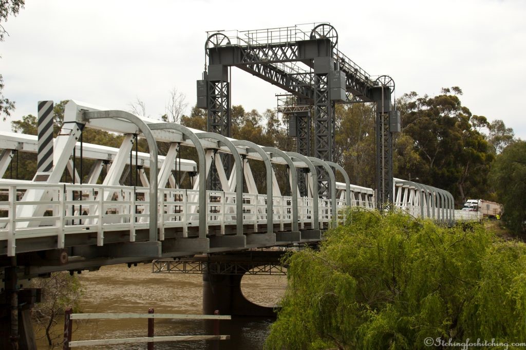 Stopping at Swan Hill for a walk we are amazed at the improvement in the town since we were last here only a couple of years ago. We find a great little gelato bar and cafe called Jillarty’s and sit in their quirky courtyard whilst we lick our way through yummy Pear and Ginger Gelato. We fill the car up with fuel and have a look at the old, lift up, one lane river bridge which is still in operation and very busy at that. Opposite the bridge there is an interesting memorial to Burke & Wills and the fact that the only member of their party to survive was the Swan Hill lad named King, who had joined their party as it passed through.