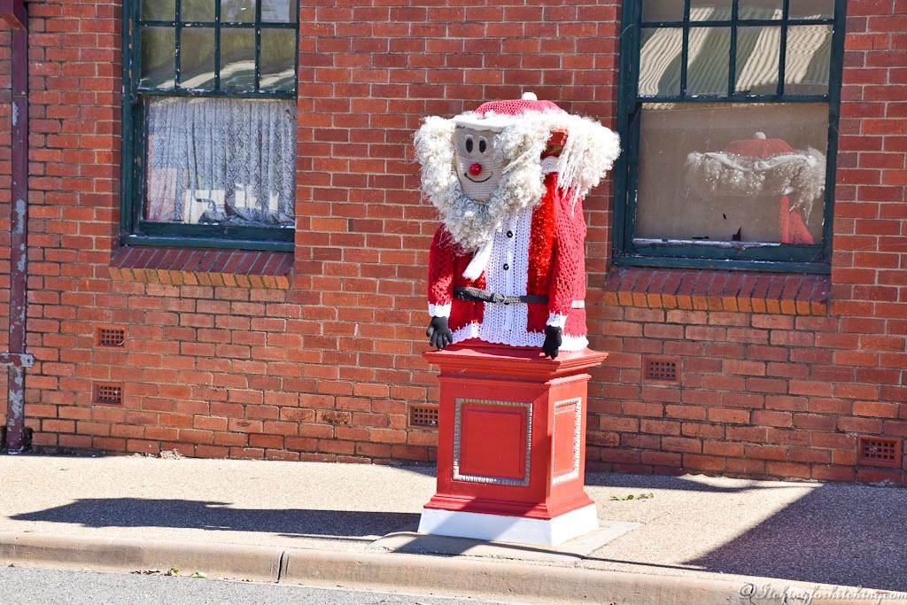 Being Christmas, the yarn bombers have been furiously at work and one could say “Jaysus, Mary and Joseph, Christmas has come to Chiltern!”. There are angels and Santas, kangaroos and cockatoos even a knitted lizard and aliens in Xmas hats. The craft community has gone crazy.