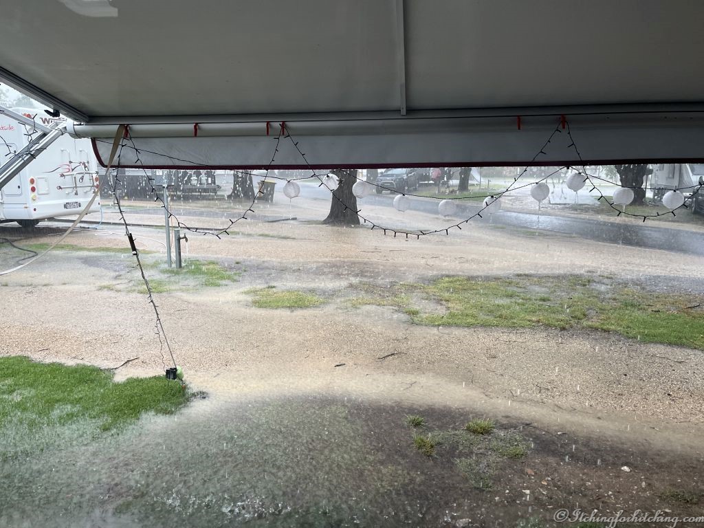 Mid-morning storm clouds gather and we get a little rain. With a bit of Aldi shopping to do we drive into Wodonga. Gosh, this town is growing. While we’re at it we pick up a new towball cover as Woody keeps getting grease on his shorts. As we leave town the heavens open and it starts to hit Chiltern on our return. It rains solidly for about 90 minutes leaving the park awash (thank goodness for our concrete slab) and the unpowered lawn section has turned into a lake.
