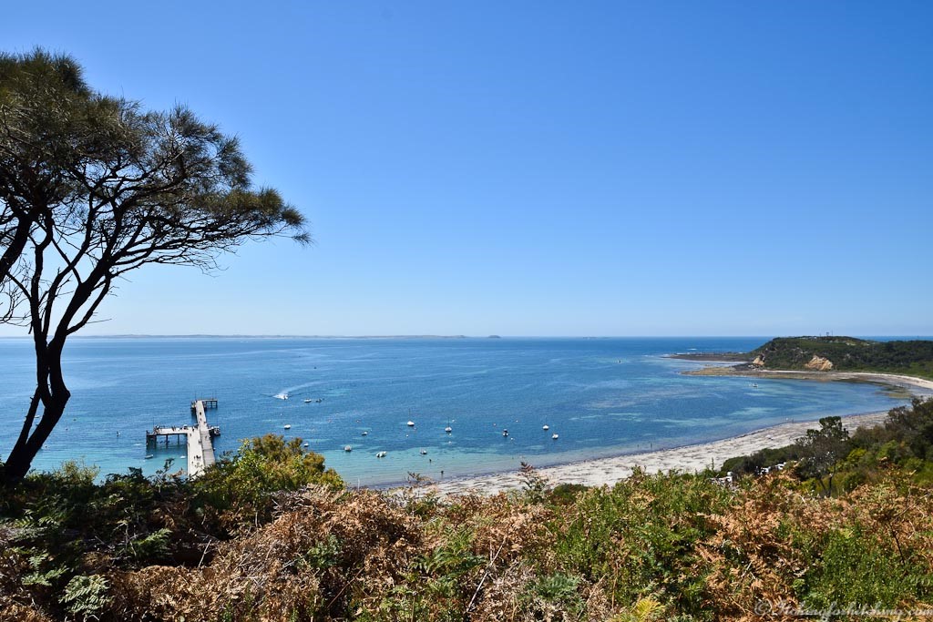 Flinders Pier and beach, Phillip Island & The Nobbies in the distance and the wide western entrance to the bay