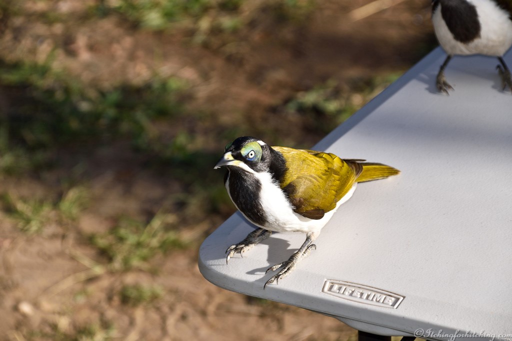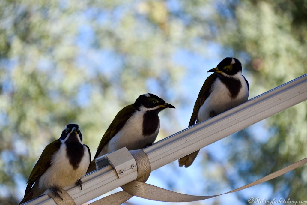 The other day I noticed sparkly little shreds of nylon hanging from the stitching on our caravan awning. Birds! Bloody birds! They hang upside down, they beg for tucker, they tiptoe back and forth across the roof when we’re trying to sleep in and they just love picking away at stitching to feather their nests.