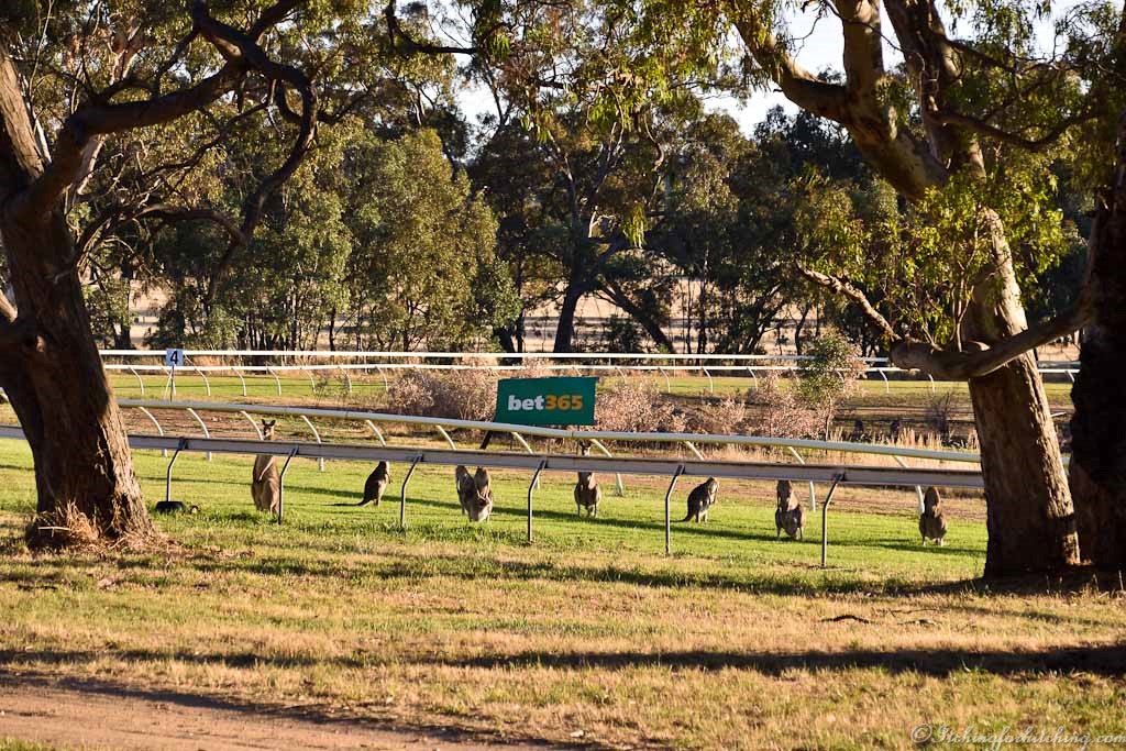 At happy hour we just have to crack open a sparkling shiraz. We cook rissoles in the evening and kangaroos come down to graze on the green grass of the racetrack.