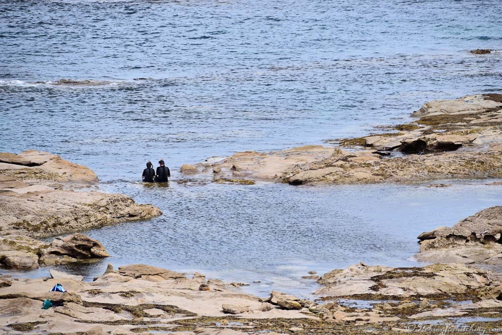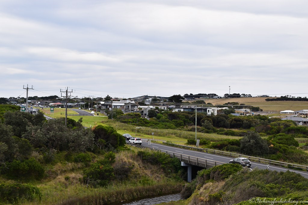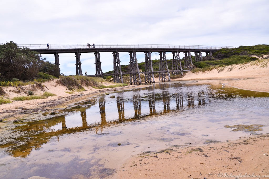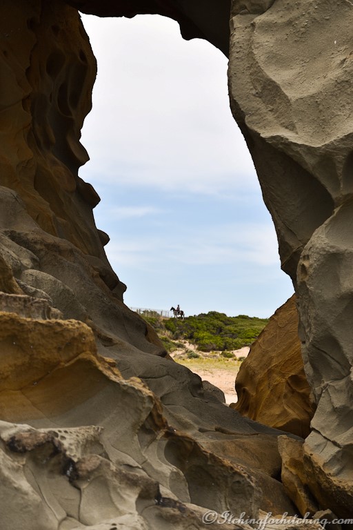 Entertainment over we walk on the beach below us. There are dozens of young families and people snorkelling in the large rock pools. It’s easy to see why this is such a popular spot. I walk around the point and catch a glimpse of a horse through a natural keyhole in the rocks. This is the first chance I’ve ever had to explore the old and often photographed railway trestle bridge. Out to sea surfers are catching nice waves with wind farm turbines as a backdrop. It’s a short walk back along the rail trail to camp.