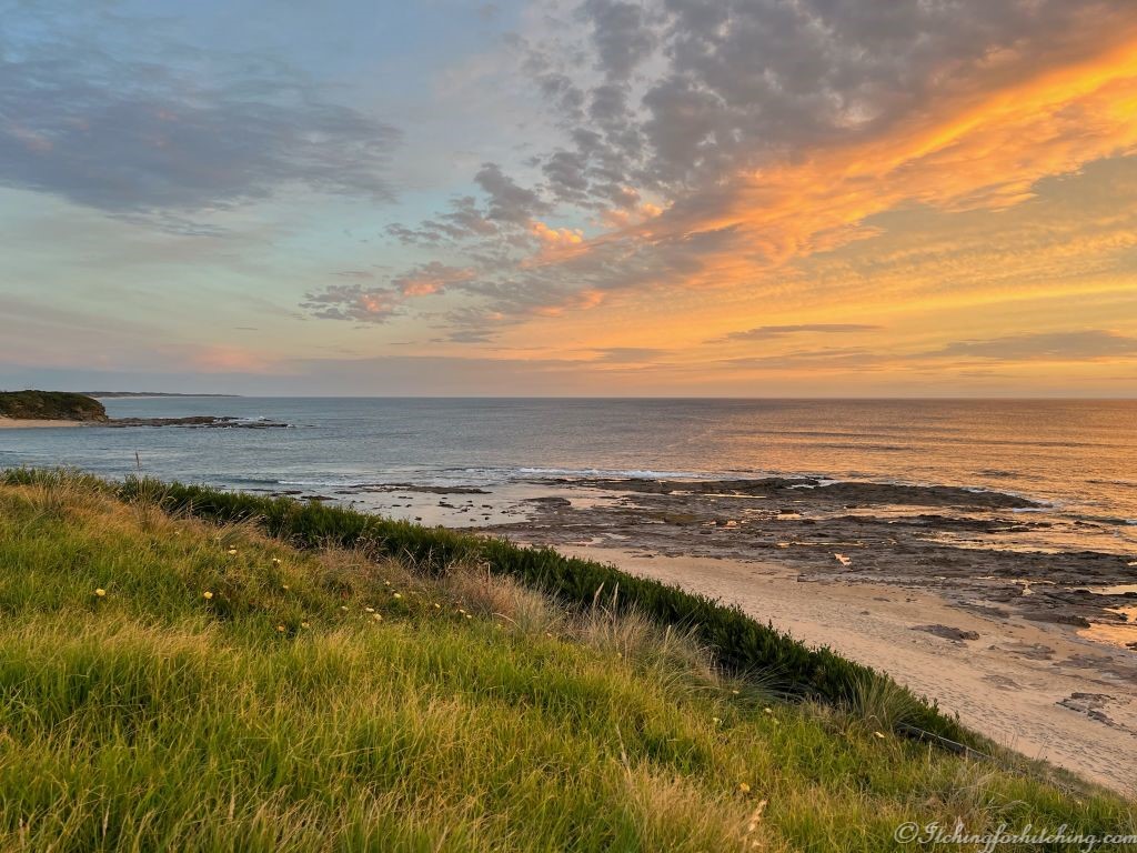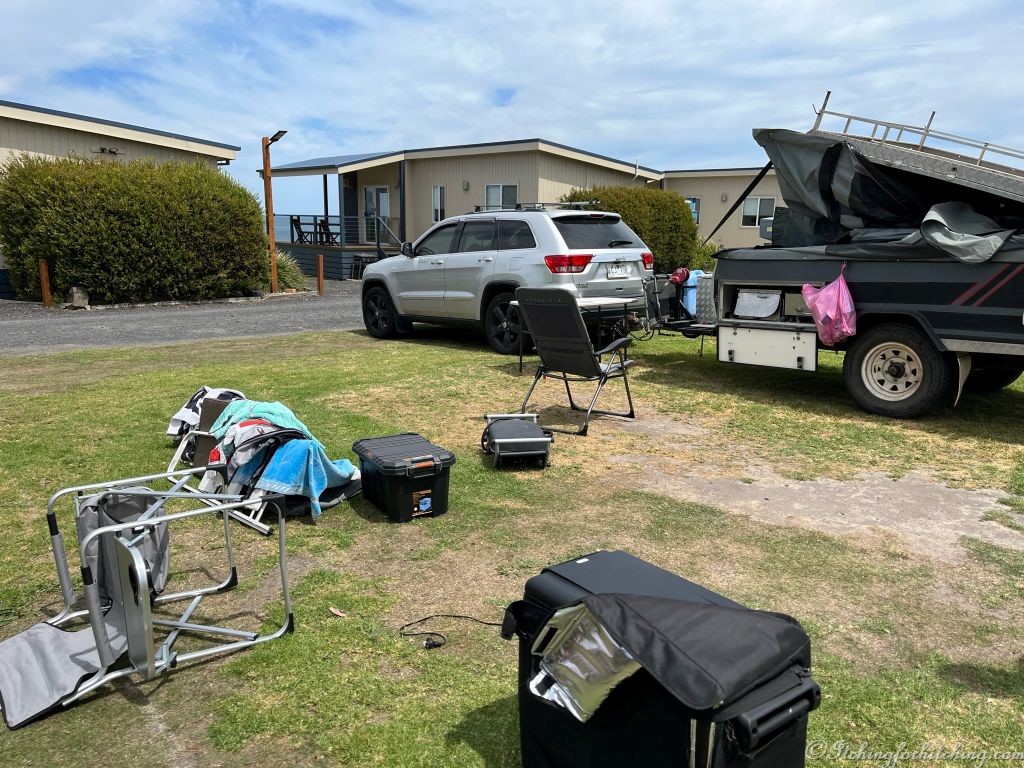 We pull into Kilcunda Ocean View Caravan Park just behind Toothless and his Missus. It’s funny how many times you just arrive together having made no firm plans about time. The park is much better than we had imagined. We’ve driven past here many hundreds of times, but the caravan park is just below road level and driving by you only catch a glimpse of caravan roofs, which isn’t such a good look. Tucked below the Bass Highway and on the edge of the cliff the views are extraordinary, and the sites are nice and grassy. This means we won’t have to put our poxy old mat out. Woody recently washed one of our rubber mats with the Gernie and blew the thing to smithereens. The other will just have to stay dirty until we can get replacements. Where are the Aldi camping gear sales when you need them?