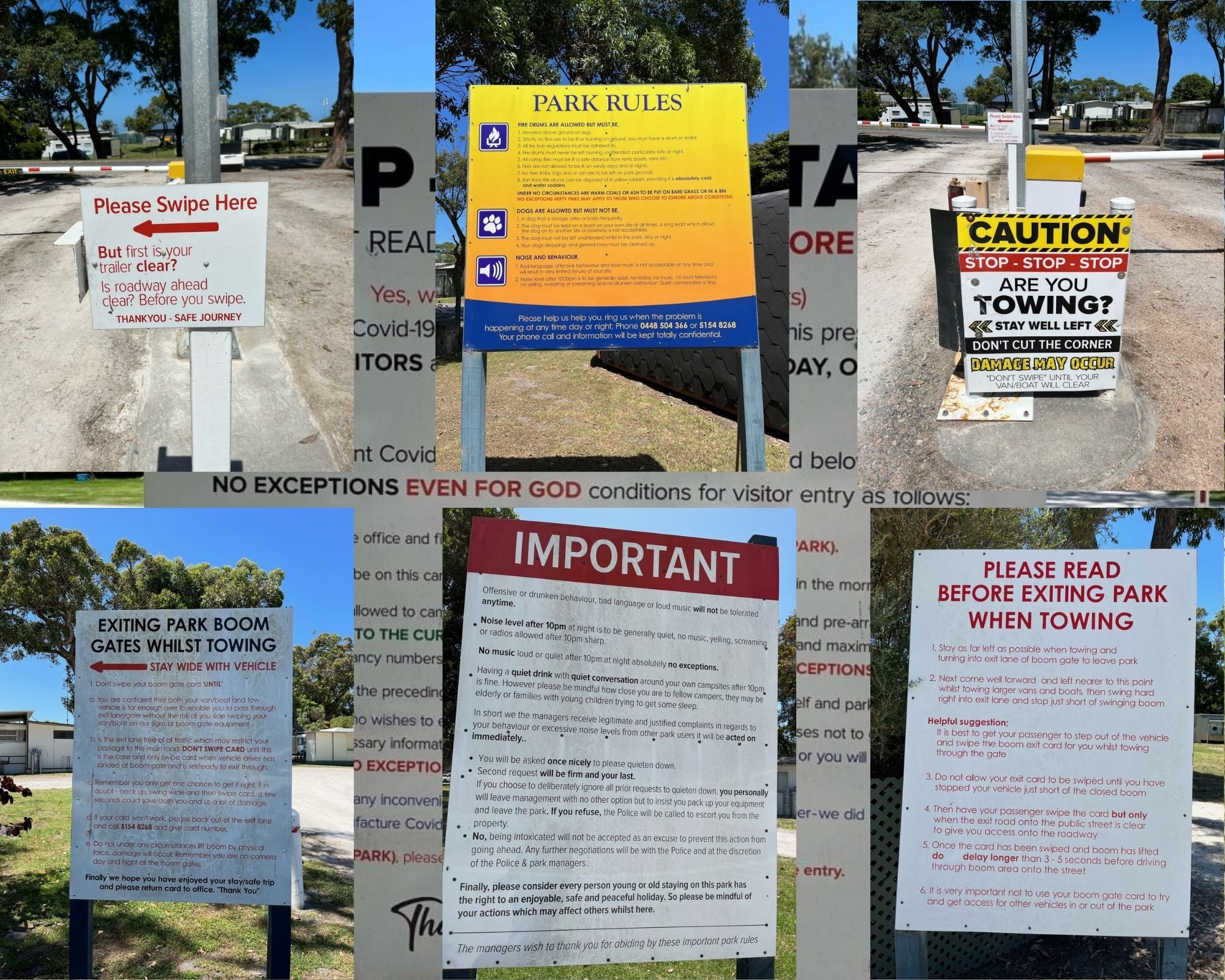 Being Covid safe we wait and wait outside reception as I & S are checked in. When it’s our turn to enter we find out why we had to wait so long. The check-in spiel rivals the Gettysburg Address in length and details everything including how to press the buttons on the toilet entry lock. I think I fell asleep somewhere between how to use hand sanitiser and how the magnetic sensor pad works at the boom gate. Forgive me I’m old and tired. El Prado walks in and the spiel starts again. Eventually, we pay our money and race out trying not to laugh. Then we notice the pole hidden behind the hedge that our caravan is sharply angled towards. Thankfully we manage to extricate the awning from the hedge and get ourselves clear, but from the state of the pole, a lot of caravans have found it too late. I wonder if that was mentioned in the check-in spiel? The park is in 2 sections, cabins near the sea and caravans further behind across the road. We soon realise that it would have made more sense if the office had been located on the road behind as we then zig zag through the cabins to the other park. Thank goodness our van is short.