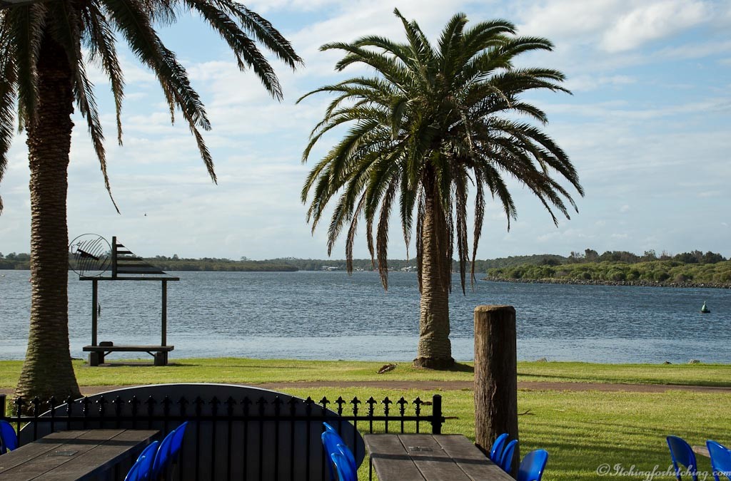 Driving up the coast we’re noticing that the vegetation is becoming thick and lush. At Taree walking along the banks of the Manning River, we can see evidence of the recent floods. We have lunch in Frank Mills Field which is a nicely treed park on the outskirts of town.
