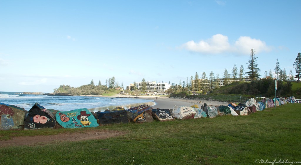It’s an easy drive on to Port Macquarie and longing for a hot shower we check into the Leisure Tourist Park. The park has a tropical feel with lots of palm trees. We are too far from town to walk in (we really must invest in some bikes), so we drive around and marvel at how much the place has grown since our last visit. Gated estates seem to be popular here but we are taken with the little community of Settlement Point which consists mainly of older waterfront holiday homes on large blocks of land on a long spit in a bend of the Hastings River. The place has the feel of Christmases past and cricket in the backyard. We drop into the Port Macquarie pub for a drink on the veranda. Although tiredness is starting to creep upon us, we walk along the breakwater to Town Beach. The rocks on the Hastings River breakwater have been decorated with messages from families who have holidayed in the town. Each rock is painted differently with pictures, poems, and tributes, it provides a wonderful insight into the holidays that hold a special place in many people’s hearts.