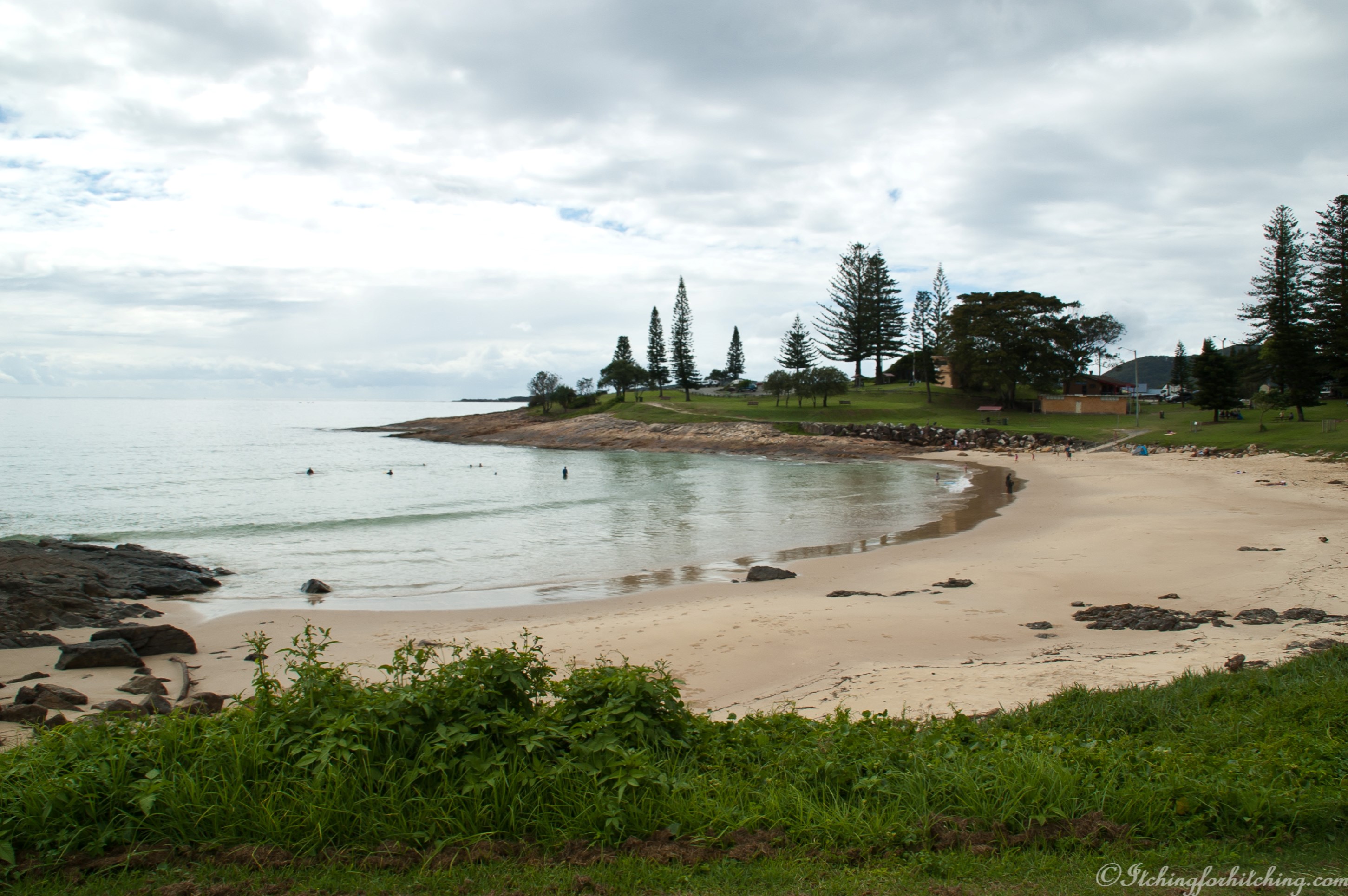 It’s a cool morning with light cloud, it obviously rained overnight but we didn’t hear a thing. We are surprised to find that the duplicated road has now ended so we must be more careful as it constantly changes from one to two lanes and back again, will this highway ever be completed? We leave the highway at Kempsey and follow the broad Macleay River to its’ mouth at the holiday town of South West Rocks. The sight of the morning mist over the river and the small dairy farms is well worth the drive. South West Rocks was once a penal colony it has wide sandy beaches and directly in front of the shops there is a small cove called Horseshoe Bay. The bay is fringed with Norfolk Pines, a few keen surfers are waiting for waves. The caravan park is wedged between the beach and the shops, how fortunate! Down by the creek, the undergrowth is thick with lantana and vines and the air is filled with the smell of the rich vegetation.