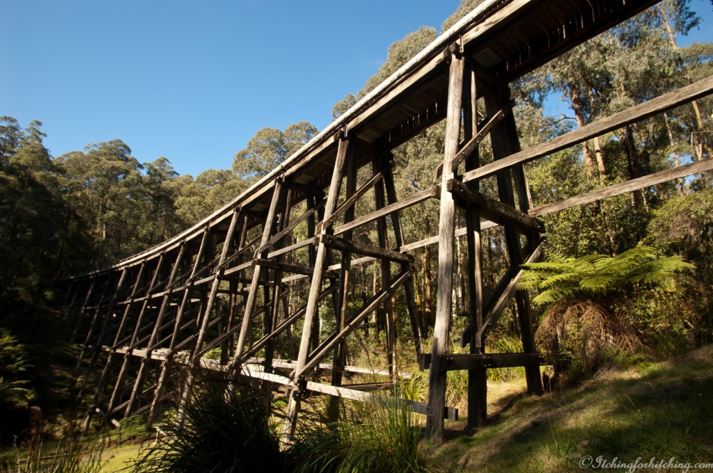 Once we have the camp in order, we drive along the ridge to Neerim South for a bite to eat at the bakery, before dropping down into the valley to the hamlet of Noojee to see the old railway trestle bridge and the renowned Toolshed Bar. The ridge in autumn is picture-perfect, the leaves are turning and the rolling green hills are dotted with cows.