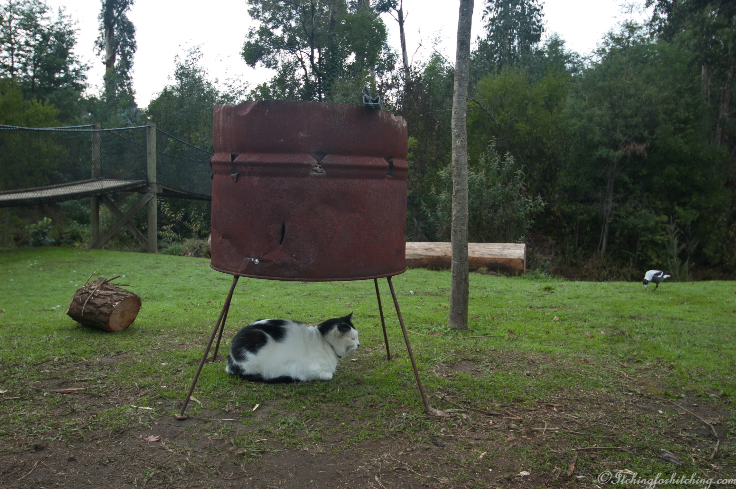 The morning is a much more agreeable 6 degrees. But the rain starts to sprinkle as we pack up. As we leave the camp the cat is soaking up the last of the warmth under the brazier while he waits for the next arrivals.