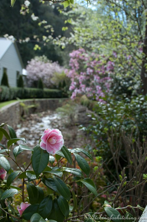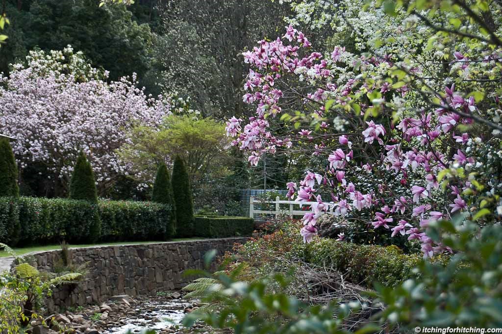 As we enter the town of Walhalla there is a Nova caravan invitingly parked on the lawn amongst white English daises looking just like an advertisement for caravanning. We have lunch at the Wally Pub sitting on the veranda in the sunshine. There is a flowering plum tree beside the pub and pink petals are floating on the breeze and drifting through the pub door like confetti. Bees are buzzing and black butterflies are alighting on the blossoms. The boys choose a mountainous mixed grill and we girls have an almost as big parma. At bursting point, we waddle off down the road to explore the town. Being late on Sunday there are very few tourists and it feels as though we have the place to ourselves with just a few locals working on their weekender cottages. The gardens are a spring picture with Prunus and Magnolias in full bloom. Stringers Creek babbles over rocks and meanders through stone walls. Crimson parrots are grazing on the lawns, the mountain air is crisp and clean.