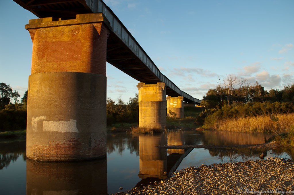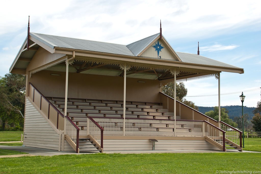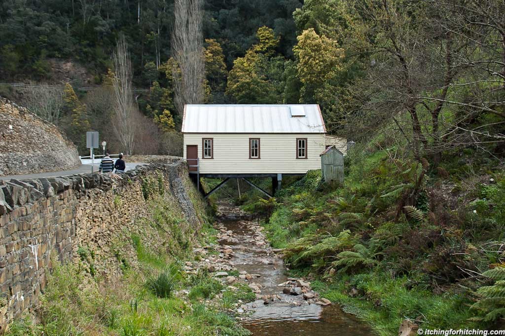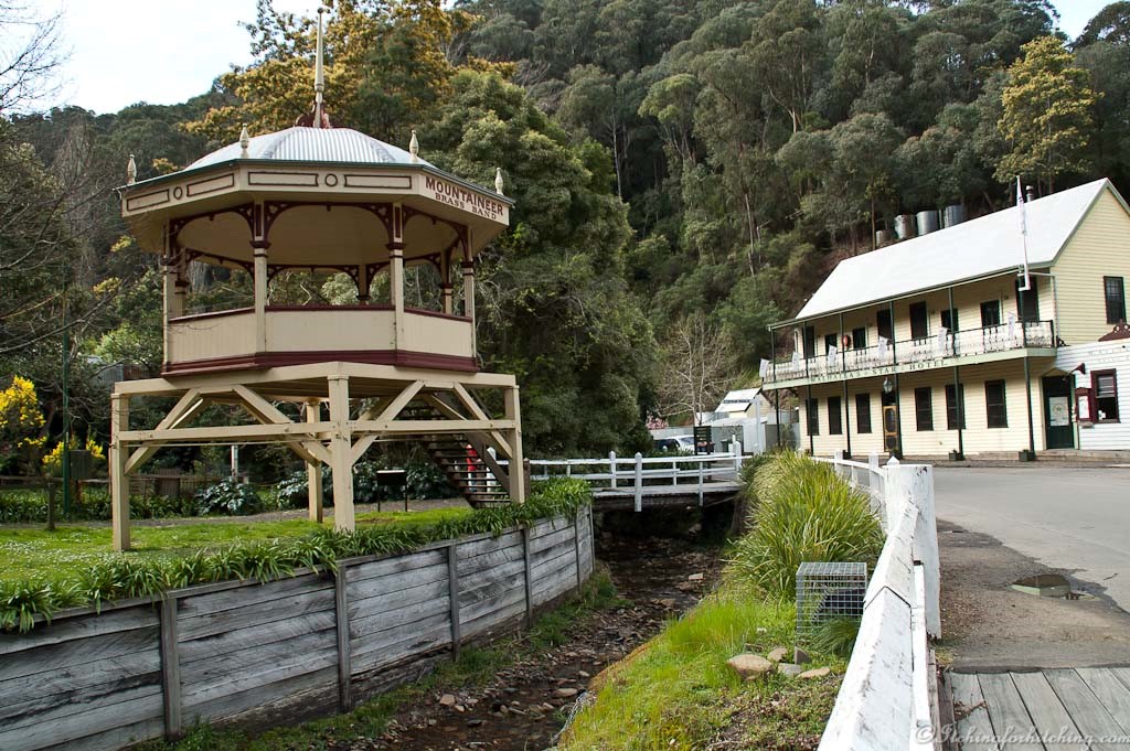 At sunrise we ride our bikes to the rail bridge, wander the stony riverbed and ride into town. We have another killer breakfast before packing up and driving to Sale, then heading inland to Toongabbie in search of the historic railway station but sadly it is no longer. At Toongabbie there is a charming Common overlooked by the Mechanics Hall and Grandstand. We pile into the Passat and go out to the Cowarr Weir but it is closed for maintenance, there is a caravan park here. We see a dirt road and a sign pointing to Walhalla and only 30kms away which sounds too good not to take via a sealed road. We pick up the rig and head off. As we climb up the ridge there are expansive views over the Latrobe Valley and we count four power stations and a paper mill. After the little town of Tyers we drive through pine plantations before crossing the range.