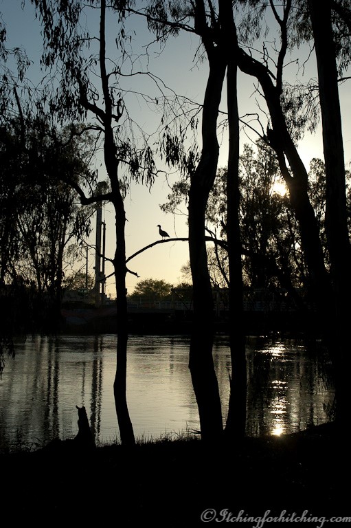 C fixes new catches to our caravan door to prevent it from blowing off whilst travelling. I can never understand why they build most caravan doors to open in the direction of the oncoming wind. One can only hope that there is a valid reason. We read in the sun and have the pork pies for lunch. C drives us over to the local lake and we have a few beers at the Barham Golf Club. Time flies and suddenly we have to get back to camp for Happy Hour and the other M has got us all drawing palaces in some crazy game which is another miserable failure on our behalf. Our M cooks a delicious Massaman curry and we sit outside under their awning.