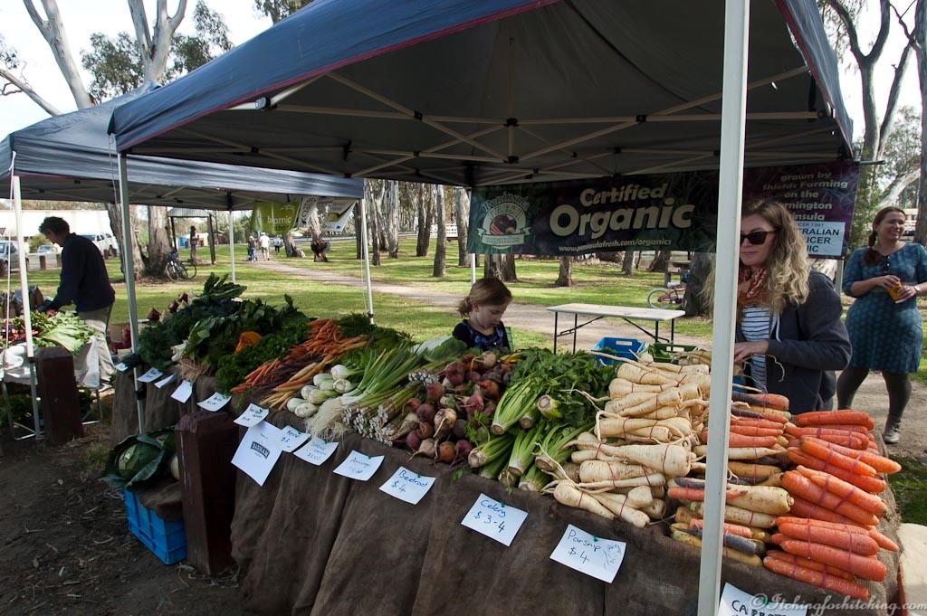 M and I photograph the river then hurry back for the muster breakfast. The boys are cooking a mountain of bacon and eggs and it is delicious. We all walk across the river to the Koondrook farmers market and we can’t resist the homemade English pork pies and fresh tomatoes. They even have locally grown organic rice.