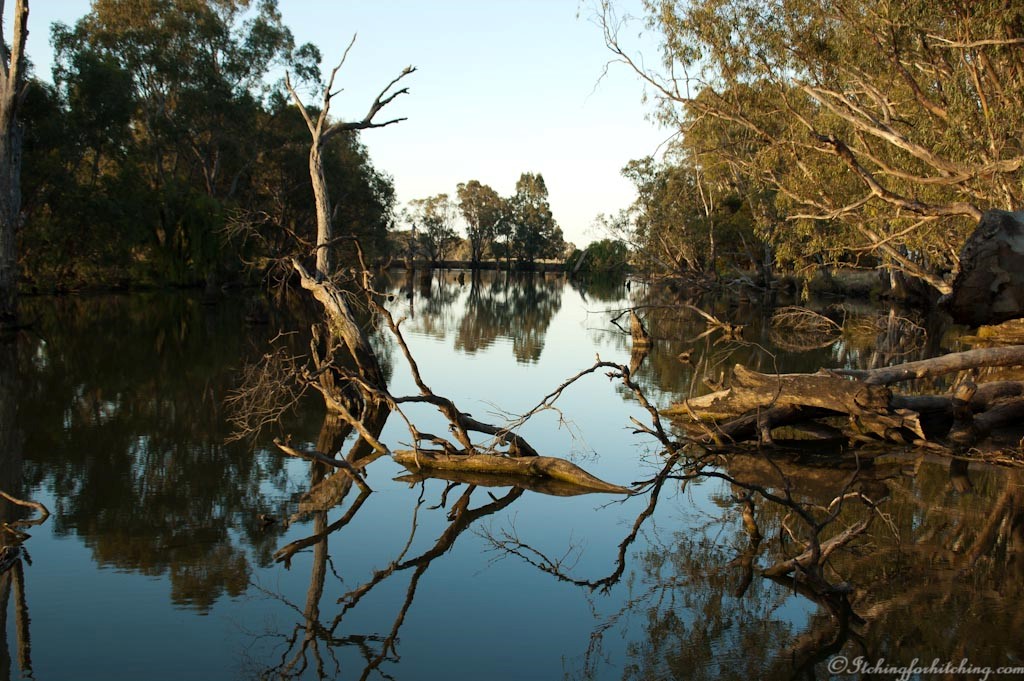 We wake to the screech of cockatoos and the smell of hot, dry bush. Which way is the river flowing? Who cares? It doesn’t matter. Emerald green willows are dipping in the water. Noisy galahs are chattering and every so often a water hen honks. It is so reminiscent of the Murray. The camping community is very friendly so we unhook and drive into town for a look around Elmore. It is 32degrees and the town is slow and sleepy. We drive on to Rochester and back.