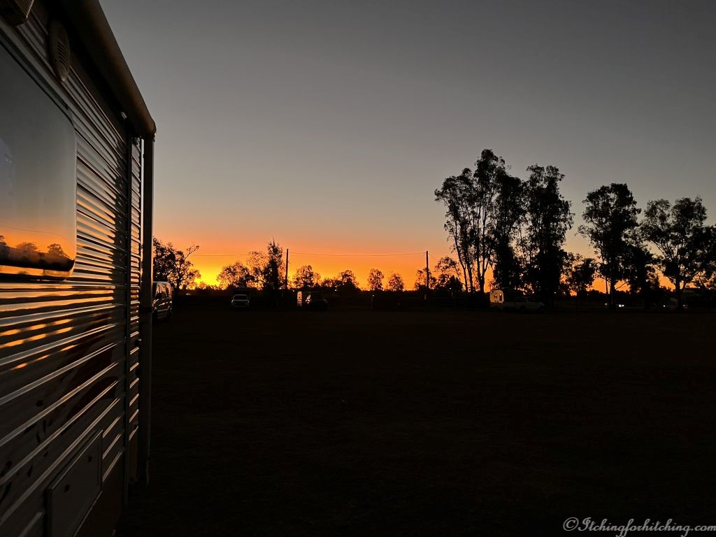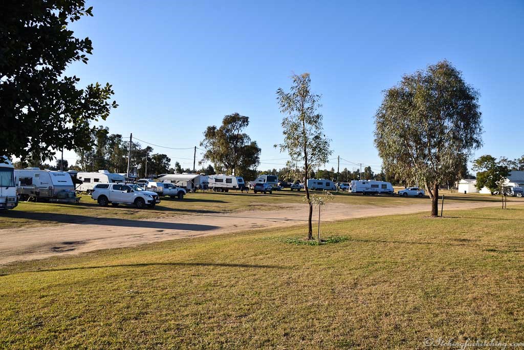 The Narrabri Showgrounds are large and there are about 40 caravans and motor homes already camped here. We search for a vacant power pole and pull up. Lo and behold we are right beside friends D & R and this is the 4th time we’ve run into them while on the road!