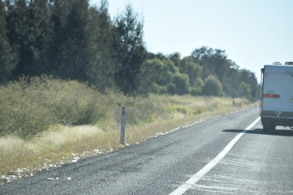There’s so little roadkill this year, the least we’ve noticed. Just south of Moree the prickly pear cactus start appearing, a sure sign we’re getting close to the Queensland border. We stop for a quick break in Moree and hopping into the van I quickly discover that there’s been a party going on. Although the kitchen cupboard is firmly closed the utensils bucket is on the floor, its contents knives, forks, chopsticks and spoons spread all over the place. I peek inside the cupboard to find that the interior light that hasn’t worked in ages is now on.