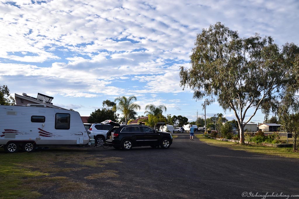 We cross the Queensland border at Goondiwindi (pronounced Gunda Windy by the way) and pull into Redman Park for a bite of lunch. It’s a pretty park with plenty of green grass and a dump point (which might sound silly but it is of the utmost importance to us caravanners). I cannot believe the transformation in Goondiwindi. Whenever we’ve stopped here it’s been dry or like last time, dry and dusty. But now, it’s a green and shady oasis. We need bread and when debating on which supermarket to go to a voice comes over the radio “Coles is closed”. Of course, it’s Sunday and only the Foodworks is open, we keep forgetting that businesses in the bush close on weekends. We visit a very good and reasonably priced Foodworks and later learn that the Coles supermarket is only open Tuesday to Saturday.