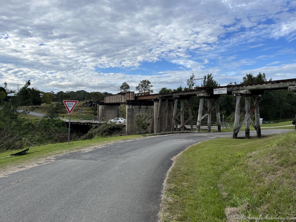 The rain started again during the night. We drive into Gympie in search of a quick haircut for yours truly. I drop Woody off at the shopping centre and drive over the hill into the CBD. This town has streets that are reminiscent of Dunedin (home of the world’s steepest street) and at times it’s impossible to see the road ahead as it drops away at such a steep angle. Mary Street is one way, so I take another in search of a parking spot. Blimey, not only do the streets have ups and downs but the camber is frightening and I find myself leaning towards the passenger seat as if I’m riding a bike.