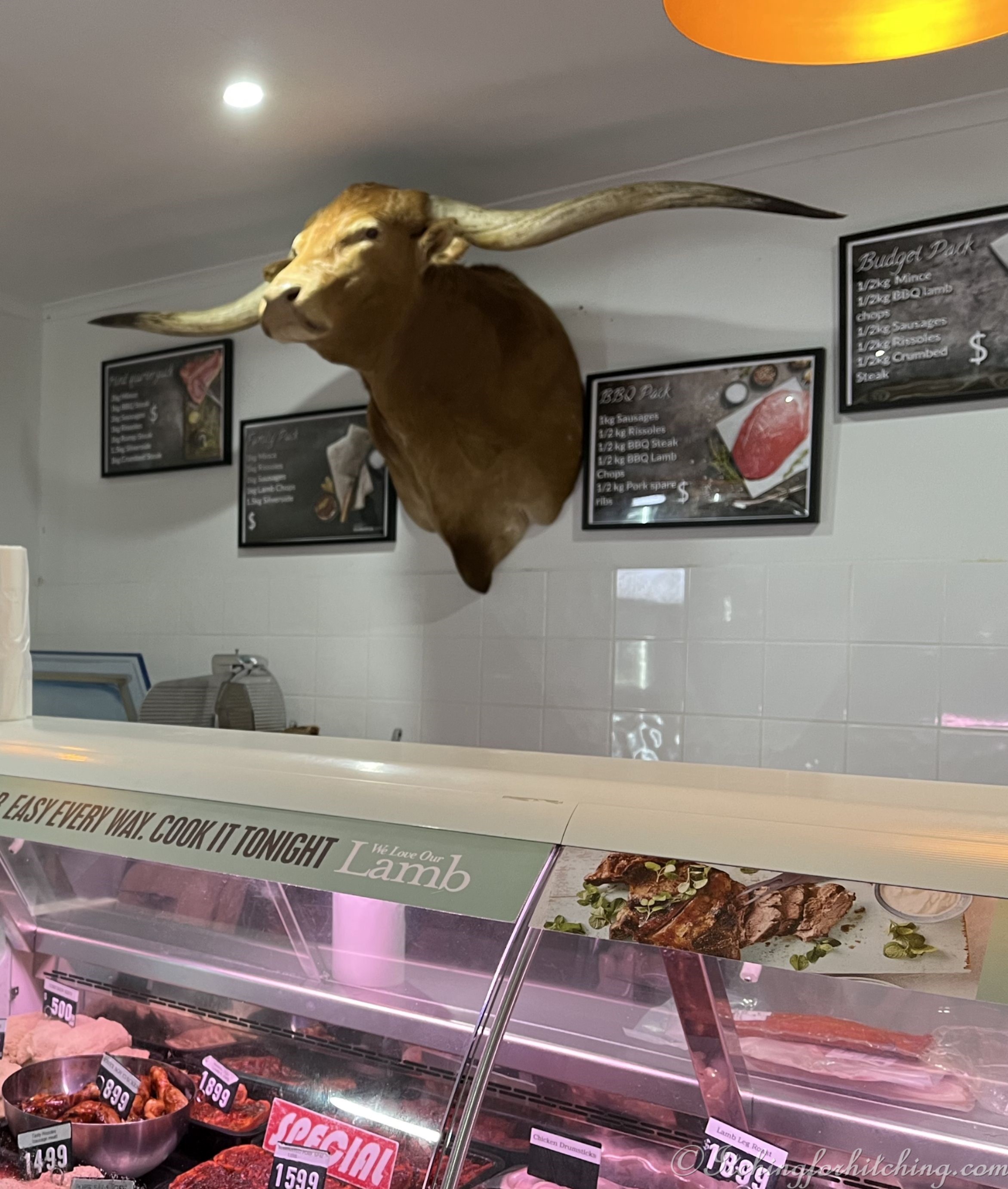 We stop at Kilkiven because the butchery here smokes their own meats and we can never go past without dropping in. Standing under the stuffed head of a very large bull we buy good old-fashioned bacon, hams and cabana flavoured with jalapeño and cheese.