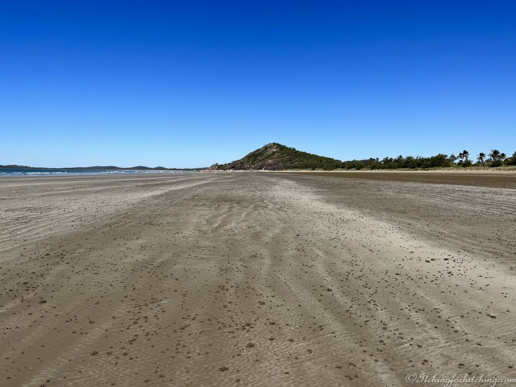 Lunch in the sun is divine. Woody washes the dust off the car in Yeppoon while I take a long walk on Mulambin beach. I say long as this is a very long beach, it’s almost an optical illusion and when the tide is at its lowest, it’s so wide that it feels like a kilometre just to reach the water. There have recently been quite high tides with the water up in the dune grasses. People are walking dogs and riding bikes on the hard sand. I find a couple of cowries, a white-bellied sea eagle soars overhead, or is it an osprey or a brahminy kite? These birds are going to require much closer study.