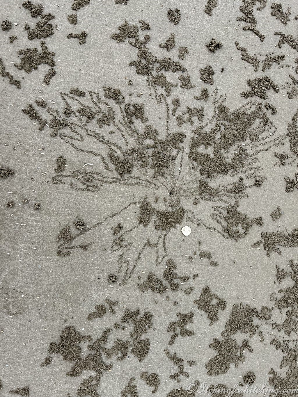 Beach art by sand bubbler crabs with a sea dollar