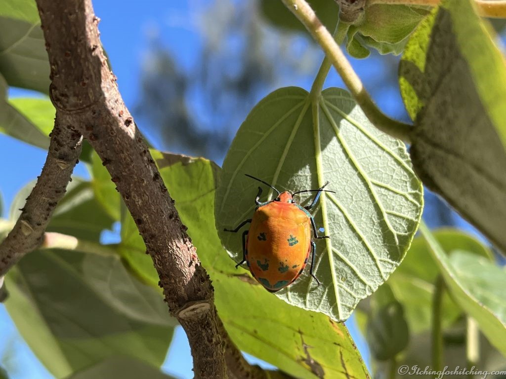Walking back from Kemp Beach, I take note of the plants along the pathway, hoop pines, coconut palms, beach almonds, pandanus, and the undergrowth, poinsettia and lantana just to name a few. The beach hibiscus is home to the hibiscus harlequin bug, a stunning little orange bug with sparkly metallic green splotches on its back.