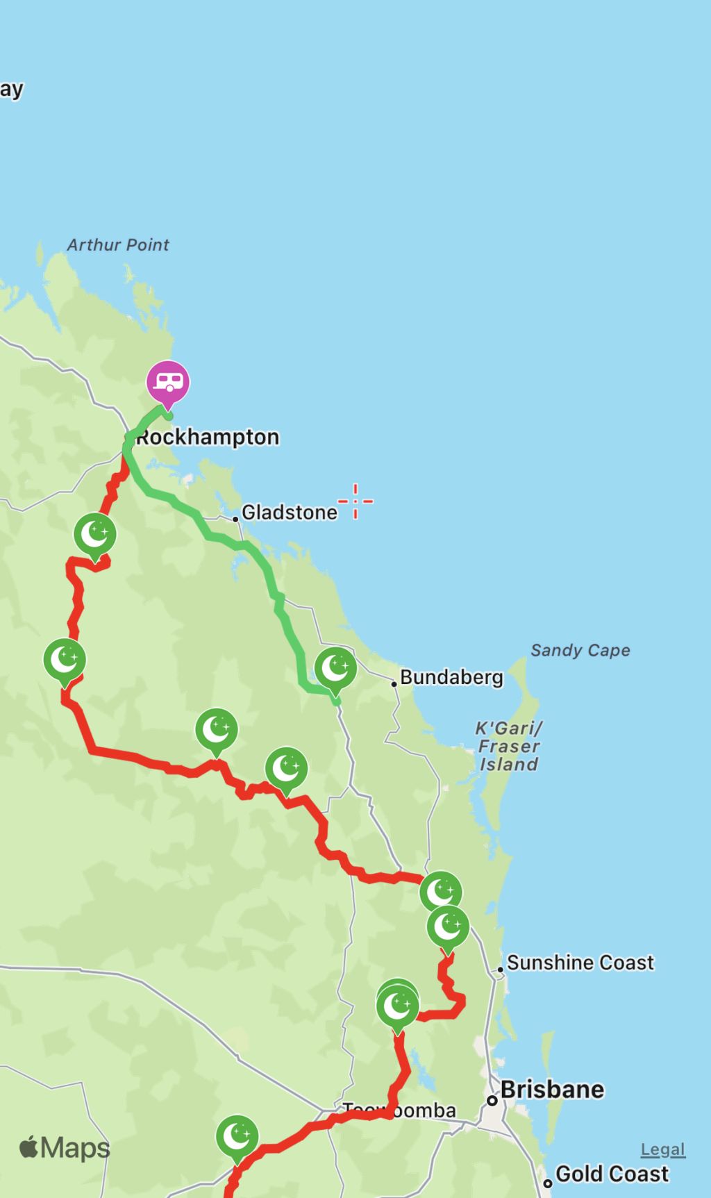 The car is making its revving noise again. The Bruce Highway has a lot of potholes and corrugating from the floods. After clipping a squashed solar panel on the road we hear a knocking sound. Pulling over at Calliope rest area we find that thankfully, it is only a stool in the back of the car. The rain has passed. I notice the car struggling and not accelerating on hills and at Beneraby a red light comes on. We pull up again to check the manual. It’s the Malfunction Indicator Light and the manual says that it’s drivable if the light isn’t flashing. With bated breath, we push on.