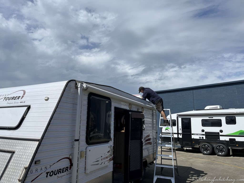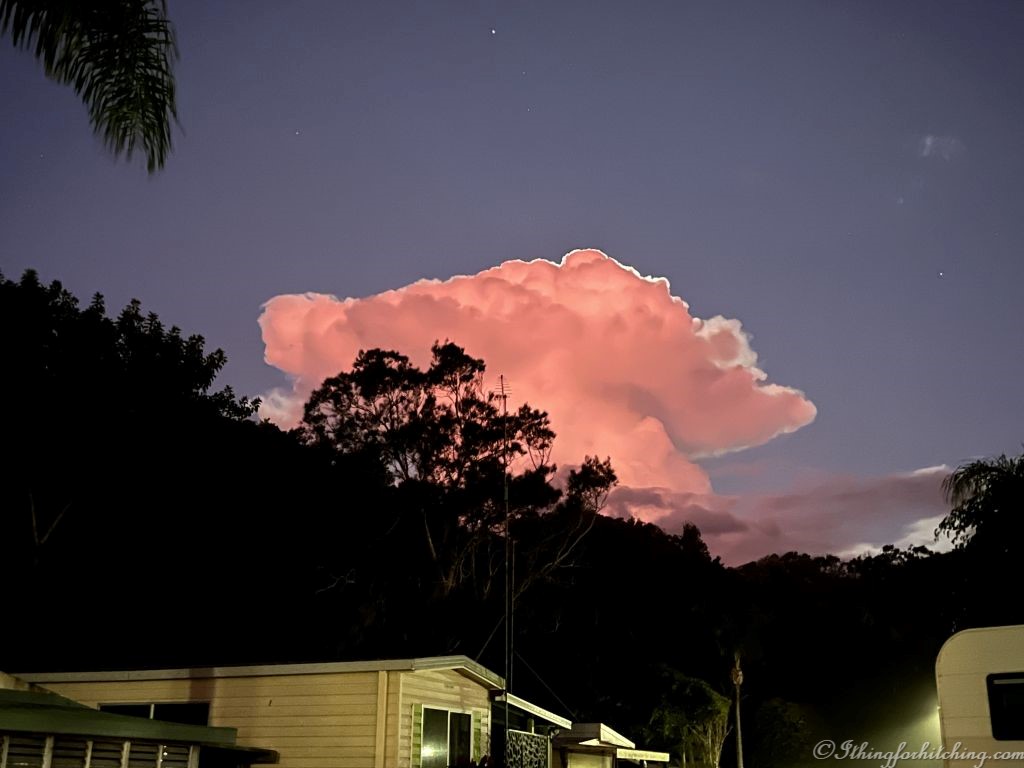 We’re up early and get away by 6:30am. The light rain becomes heavy when we join the Pacific Motorway and stays with us for hours. It clears by Yamba giving us a good run down to Coffs Harbour. This is such a good road nowadays. ABCO vans are just off the highway. We tell the guy that our hatch is broken and that we’ve taped it up with gaffer. He jumps onboard, sticks his head in the shower, and shouts “It’s fixed!” Cheeky bugger. Half an hour later we’re on the road again with a new hatch.