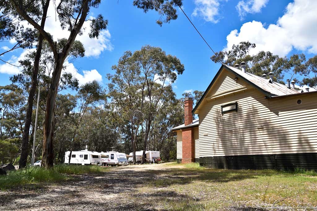 The campground is behind Fryerstown School No. 252, built in 1915 to replace an earlier smaller one on the opposite hill. The school now is used for community purposes and is set up to allow freedom camping. Though the stony ground is not quite level it covers a large area and with levelling ramps is adequate. A covered veranda area between the classrooms of the old school makes a delightful deck area out of the weather and there are two well-appointed bathrooms with toilets and showers in a side shed. Water is available for top ups and power on the veranda for charging devices. It costs us $10 per head per night.