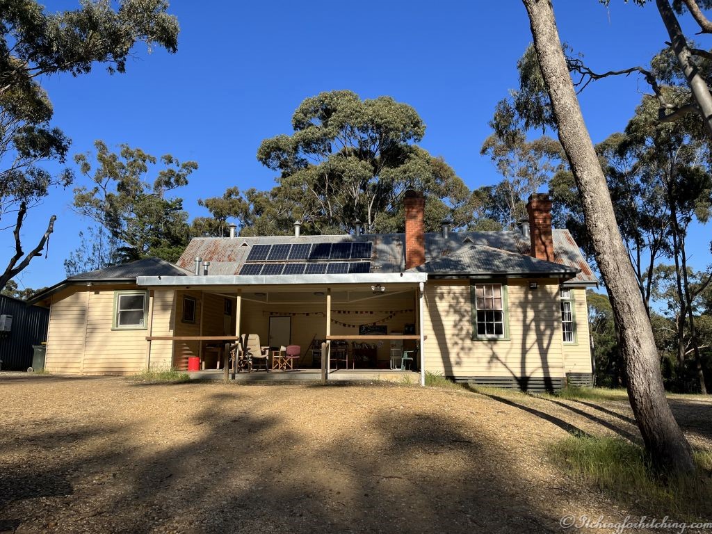 Woody who has rung around several camps enquiring about their suitability since the rain, gives me a piece of paper and asks me to ring the lady to find out how to get the key to the bathroom. I ring and she tells me that no key is required, but when I ask where the bathroom is, she tells me that we can’t miss it because it’s right near the cricket pitch. With the phone to my ear, I look about, behind me is the school and in front, there’s bushland and a few distant houses. I tell her there’s only a school and she sounds rather flummoxed. It’s then that we both realise that we’re at cross purposes. She’s in Meeniyan and I’m in Fryerstown. I turn the paper over and there’s the number for Anna of Fryerstown. Another phone call is all it takes to find the bathroom key and the bathroom that is in a nondescript tin shed.
