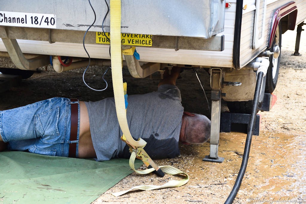 It’s a short drive into Castlemaine for toppings for tonight’s pizza. We return to find Toothless under our van and in a pool of mud. We had mentioned that the water tanks were leaking and he’s endeavouring to fix them. But he’s unable to solve the problem.
