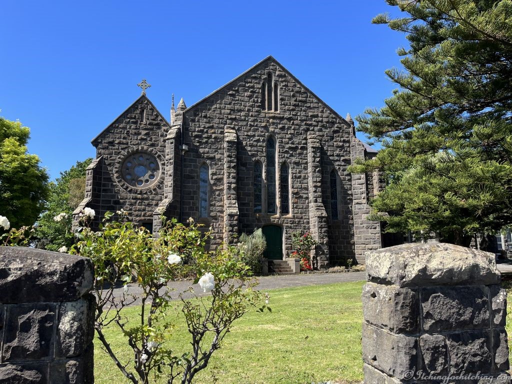 VeeWee gets an early start to head home. I walk into town to pick up a couple of prescriptions from the chemist and end up leaning on a fence sketching the Anglican church (we later discuss how odd it is that the Catholic church here feels cold whereas the Anglican church feels so welcoming with its rose gardens and unusual buildings in the gardens). Woody meets me in the supermarket then he walks home while I take the groceries in the car. Home is always where the caravan is.