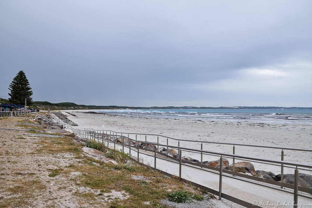 We are surprised at how spectacular the beach is at Bridgewater. But it is raining. Soft white sand and a curious blue sea, like something from a soap powder advertisement. Long hanks of kelp, string along the sand. There’s not a lot here, a kiosk, a surf club, and a smattering of homes perched on the hillside with more of those priceless views. I take a quick walk on the beach but the rain isn’t pleasant. It’s becoming too miserable to walk out to the lookouts and cave so we continue our drive to Bridgewater Lakes hoping we might find a cosy café for lunch, in which case our sandwiches could be renamed dinner and toasted. Noticing a small lake on our left, then another we wonder where the town is. Then our phone signal drops out. Damn you Mrs. Google! I plug the GPS in and wait for her to pick up a satellite, and she does, just as we pass Portland airport! Oh dear, we’ve done a big loop and are back on the outskirts of town. If there is a town at Bridgewater Lakes…well, we never found it.