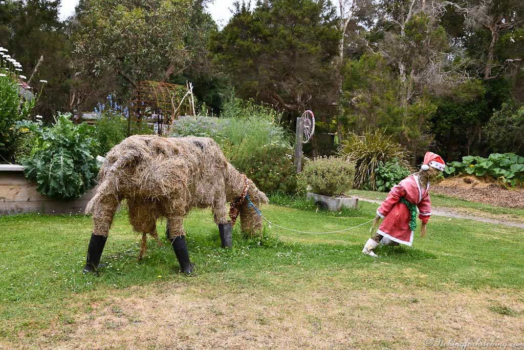 Even though we’ve only been back from Portland for a week or so, it does feel good to be back in the van and in this delightful town. With sketchbook in hand, I visit the community garden which like everything else in town is close to our park. Cabbage moths are in abundance flitting about the plants. On the lawn, there’s a Santa pulling a huge well-endowed reindeer. I perch myself on a plank and enjoy the tranquillity. Two ladies (about my age) wander down the pathway and we get into a discussion about the reindeer while they prod the straw of its’ undercarriage. The garden volunteer who’s been ferreting about in the vegies pops her head up and informs us that it’s not a deer but a cow and that we’re udderly incorrect.