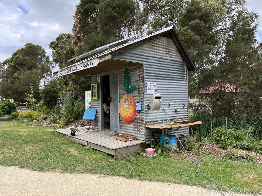 By 8:45 we’re on the road and headed for the nearest Aldi to stock up before skirting Western Port and picking up the South Gippy (South Gippsland Highway). Leongatha is busy and Meeniyan is positively jumping thanks to the summer holidays. We snag a nice grassy spot at the Meeniyan Recreation Reserve and are set up by the time Toothless and his Missus arrive. She bolts off to the toilet and sheepishly returns to tell us that she visited the men’s by mistake. Hello? I think she’s adopted one of El Prado’s misadventures.