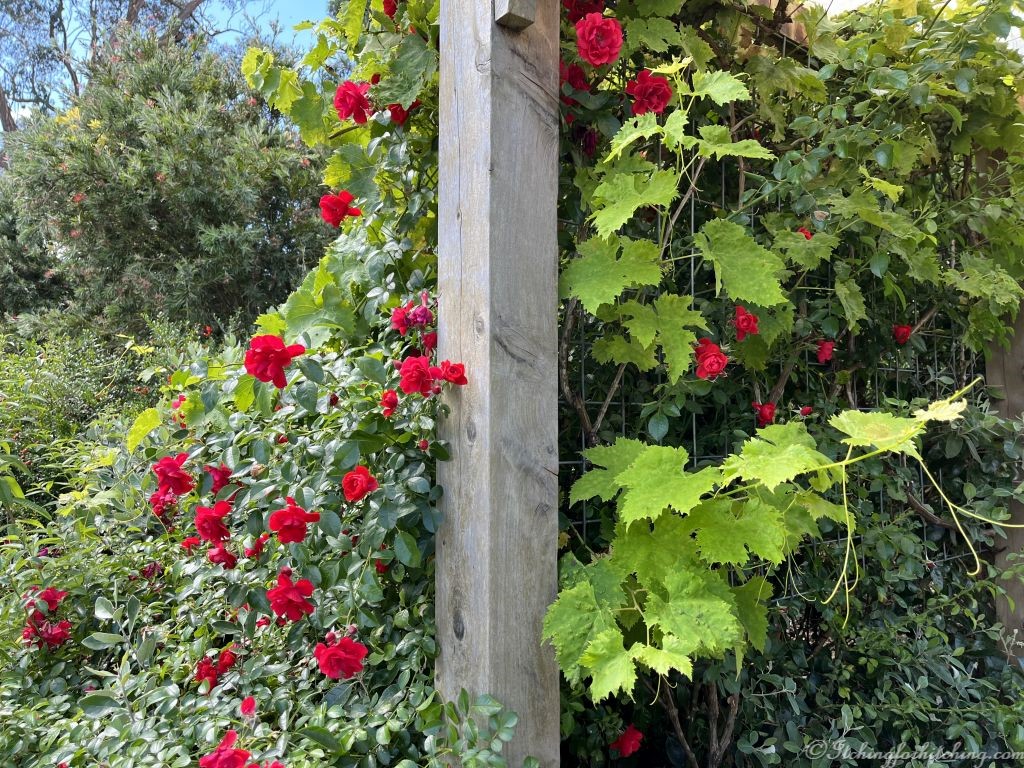 Behind the park is the community garden plot and a shady seat under a spreading grapevine. We sit under our awning, once more chasing the shade at happy hour before strolling across to the community-run pub.