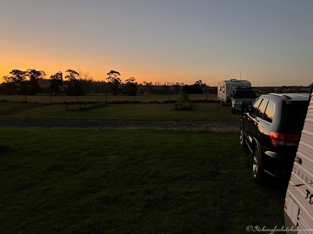 We’re the first to arrive at the Yinnar RV Stop and with plenty of room to leave the car hooked on, there’s only a minimal setup to be done, just turn on the gas and light the fridge, drop the legs, and put out the step. We walk across the road and buy kabana and sausages from the local butcher. We know their meat is good because we were here last February on our way back from Marlo.