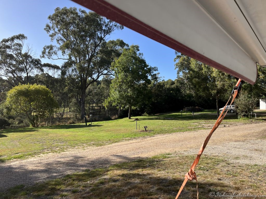 After a quiet night and a good sleep, we’re up at first light to quietly move Priscilla to the new site. It only takes a short while to be settled into our new grassy and sheltered spot. And we have bleating sheep in the paddock opposite.