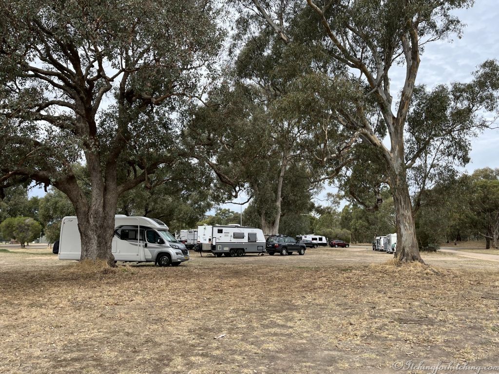 Our old mate El Prado used to rave about the freedom camp at Longwood, so we pull off the highway just north of Seymour. The town of Longwood is 2kms to the west and the large recreation reserve is impossible to miss. There are facilities for many sports even greyhounds and oodles of space set aside for overnight campers. Best of all there are flushing toilets. Every RVers dream. And we’re not on our own as 4 other vans of our group are already here and two of our mates are also coughing and snuffling. Woody happily declares “Don’t worry I’ve done a RATs test and I haven’t got aids!”.