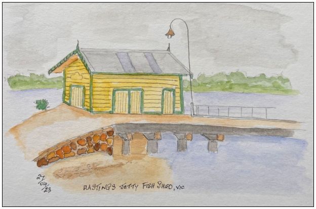 Having a few spare minutes before meeting with the ladies at the Historical Society I parked down by the jetty and did a quick rough sketch of the old fish shed that has been lovingly restored. You see, Hastings was a fishing village in the late 19th century and the daily catch was sent, as quickly as possible, up to Melbourne for sale. By the mid-20th century, fishing was overtaken by fruit growing, mainly apples and pears.